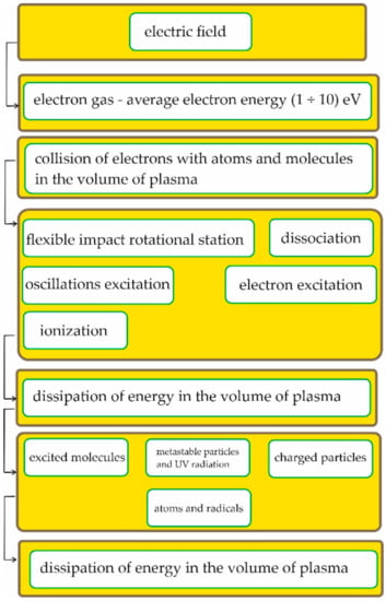 Plasma is the fourth state of matter, which is quite common in space and rare on the Earth. Research on the scientific application of plasma has been carried out for many years accompanied by attempts at technological application of the unique properties of the fourth state of matter. From the point of view of modifying the surface of a solid, the most useful plasma is low-pressure cold plasma, commonly called cold or non-thermal plasma. Its density is in the order of 1014–1018 electrons per m3. Its particularly important feature is the differentiated temperature of electrons (Te) and other components of the gas (Tg). Colloquially, it is said that in non-thermal plasma electrons are “hot” while the other plasma particles are “cold”. Usually, Te/Tg ≈ 10/100, which at the electron temperature Te = 104–105 K gives an average temperature equal to about 500 K for the ions and 300 K for the remaining particles. Thus, most of the electricity is used to produce high-energy electrons, not to heat the gas. In this way, the plasma energy is channeled into dissociation caused by collisions with electrons and gas ionization.