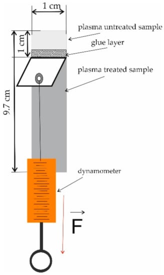 The force required for the detachment of two components joined by an adhesive can be determined by the peel adhesion test. We carried out 180-degree peel adhesion tests as follows. Two samples (a non-modified sample and a sample modified by plasma) with dimensions of 1 cm × 9.7 cm were glued together with Jowacoll® 764.60 glue (Jowat, Sady near Poznań, Poland), which is a one-component copolymer dispersion commonly used by printing companies. The adhesion area was equal to 9.7 cm2 and the adhesive was applied with a brush. The amount of applied glue was about 0.07 g, which corresponds to an approximately 0.7 mm glue layer. Then, the end of one sample was mounted in a holder while that of the other sample was attached to a dynamometer so that the force could act along the joint at an angle of 180 degrees downwards toward the fixed sample as illustrated in Figure 2.