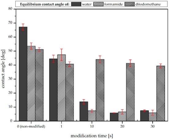 The water, formamide, and diiodomethane equilibrium contact angles measured on the examined samples are presented in Figure 3. On the initial (non-modified) sample, the water contact angle was equal to about 67.2 degrees. The air plasma modification caused a decrease in the contact angle value, and this effect can be seen in all samples. For the one-second plasma treatment, the water contact angle decreased by about 20 degrees, while for longer modification times its value decreased to less than 10 degrees and the surface became more hydrophilic. However, the effect obtained for modification times longer than 10 s was found to be comparable. This is consistent with the results obtained by Pykönen et al., who reported that, in the case of plasma hydrophobization of paper, modification times longer than 5 s did not affect the material’s surface properties significantly [8]. A similar tendency can be observed in the case of the second polar liquid (formamide). However, Figure 2 shows that the plasma modification of the samples did not affect the diiodomethane contact angles significantly. This was due to the different types of interactions between the test liquid and the surface. Zhao et al. reported that the diiodomethane surface tension only has a non-polar (dispersive) component; thus, the liquid interacts with the surface only in a dispersive way [14]. Based on this, it can be concluded that the air plasma modification did not affect this kind of interaction.