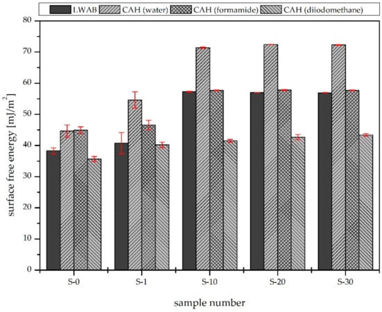 Figure 4 shows that the surface free energy of the material increased as the plasma modification time increased regardless of the approach used to estimate its value. In the case of the CAH theory and the use of water as a probe liquid, the surface free energy increased as the modification time increased up to 10 s; longer treatment times did not affect the energy values. Similar results were obtained using formamide as the test liquid. In the case of diiodomethane, no significant changes in the energy between the samples were observed.