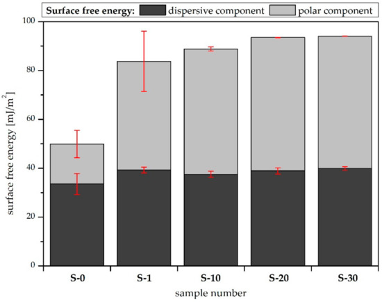 The LWAB approach shows increasing surface free energy values that are compatible with the CAH results for the polar liquids (water and diiodomethane). More details are provided in Figure 5, which shows the dispersive and polar components of the surface free energy. It can be observed that the air plasma treatment only changed the polar component of the material’s surface free energy significantly. A similar effect was observed in the case of air plasma modification of a polymer [15]. This might be due to the introduction of hydrophilic groups, such as C=O, –OH, and –COO, on the surface [16], which was confirmed by the XPS analysis. According to the LWAB theory, the polar component of the surface free energy is composed of acidic and basic constituents [17].