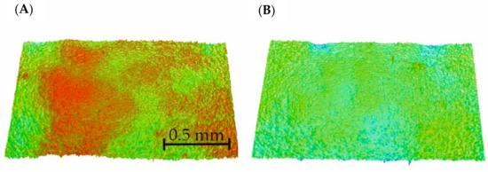 Roughness map of the selected samples: (A) non–modified sample (S-0) and (B) sample modified for 10 s (S-10).