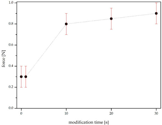 The force values necessary to detach the samples are shown in Figure 7. In the case of the two unmodified sheets glued together (at 0 s—the reference test), the joint was broken at about 0.3 N.