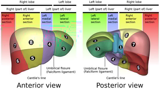 - Couinaud, C. Liver lobes and segments: Notes on the anatomical architecture and surgery of the liver. Presse Med. 1954, 62, 709–712. [Google Scholar]