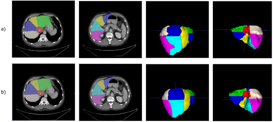 In order to define and localize in the CT volume the two aforementioned branches, i.e., the LB and RB, of the portal vein, we implemented a majority criterion based on the classification of the voxels. The first slice where the sum of the counts of the voxels belonging to Segments III, IV, V, and VI was less than the sum of the counts of the remaining voxels in the first slice above the RB.