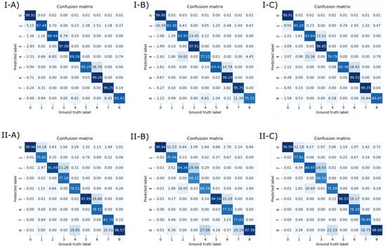 (Top) Row-normalized confusion matrices. (Bottom) Column-normalized confusion matrices. Left: Confusion matrix for the model trained with . Center: Confusion matrix for the model trained with . Right: Confusion matrix for the model trained with .