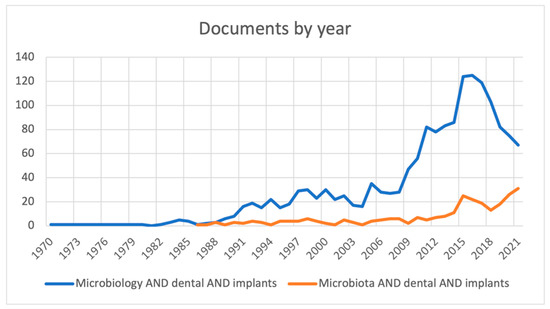 The result of the search reveals that, with the MeSH terms “microbiology” AND “dentistry” there are 30,353 articles; with “microbiology” AND “periodontology” there are 6772 publications; with “microbiology” AND “dental” AND “implants”, 1580 articles; with “microbiota” AND “dentistry”, 2609 publications; with “microbiota” AND “periodontology”, 994 articles; and with “microbiota” AND “dental” AND “implants”, 268 publications.