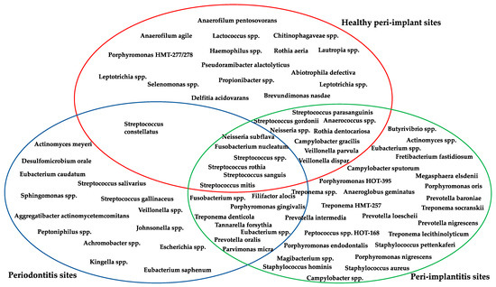 Therefore, the aim of this narrative review is to present the most recent data regarding differences in the oral microbiota in healthy peri-implant sites and peri-implantitis sites, comparing bacterial species to sites with periodontitis, showing species in common.