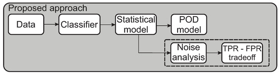 The POD approach is adapted, modified, and extended to the field of vision-based systems as shown in Figure 4. This article adapts the method; however, unlike classical POD applications, for the first time, the method is applied to process-parameter-affected vision-systems. Here, raw sensor/probe data are not used, but a prefilter in the form of a classifier is used. The classifier is evaluated based on the processed data. Additionally, a noise analysis procedure is introduced, fully illustrating the visualization and trade-off between the decision thresholds, image parameters, detection probabilities, and false positive rates.