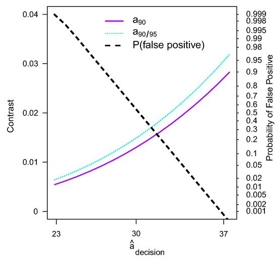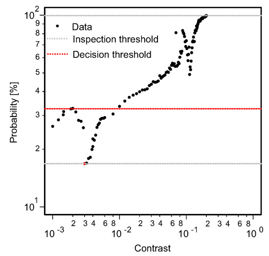 From the developed approach, it is possible to analyze the trade-off between PFP and POD. To introduce the novel approach, a single probability point is analyzed. Here, the 90% probability is used and drawn to intercept POD and confidence curves (see Figure 11). At the point of intersection, the POD, PFP, decision threshold, and the process parameter (here: contrast values) are known. These values are considered for every point on the drawn 90% probability line. A graph depicting the relationship between the POD, PFP, DT, and contrast is shown in Figure 14.