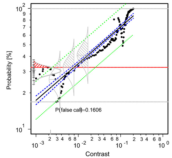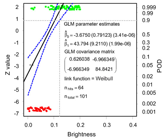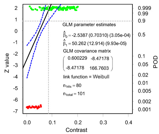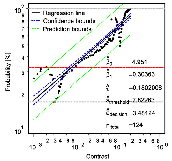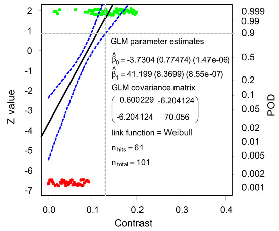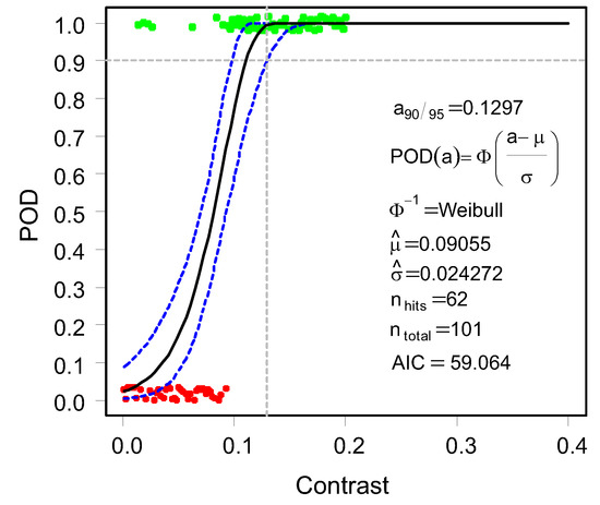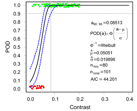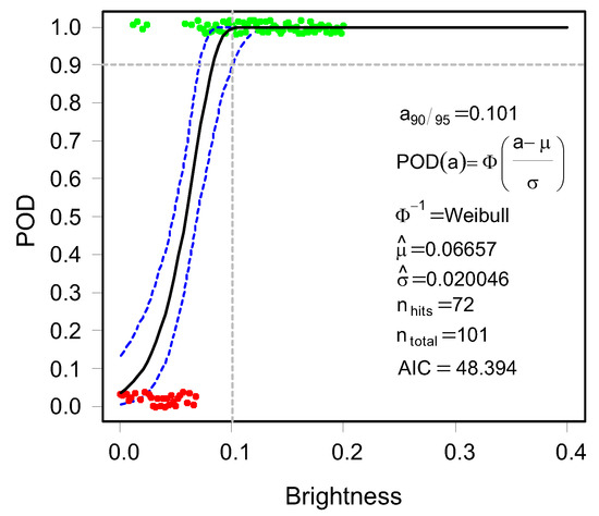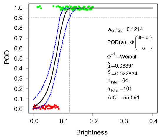 Using Equation (8), the POD curve can be set up for varying parameters. In this contribution, the varying parameters (as process parameters) are the contrast and brightness of the image. The intercept and slope are represented by the variables and , respectively, and are statistically estimated from the observations using the maximum likelihood estimation, as it is better suited for censored regression.
