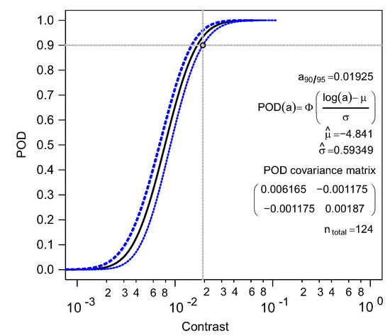where 1.645 is the z-score of 0.95 for a one-tailed standard normal distribution, and is the standard deviation of the regression line. The Delta method is a statistical technique used to transition from a regression line to a POD curve [15]. The confidence bounds are computed using the covariance matrix for the mean and standard deviation POD parameters and , respectively [28]. To estimate the entries, the covariance matrix for parameters and distribution around the regression line needs to be determined. This is performed using Fisher’s information matrix I [28]. The information matrix is derived by computing the maximum likelihood function f of the standardized deviation z of the regression line values. The entries of the information matrix are calculated by the partial differential of the logarithm of the function f using the parameters of of the regression line. From