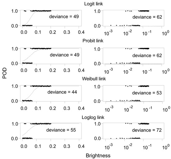 The transformed probability can then be modeled as an ordinary polynomial function, linear in the explanatory variables. The commonly used GLM in POD are the Log, Logit, Probit, Loglog, and Weibull link functions. Depending on the data distribution, a model may be more appropriate compared to another. One criterion used is to select the GLM with the least deviance.