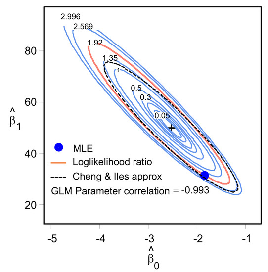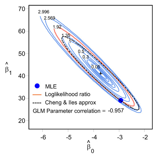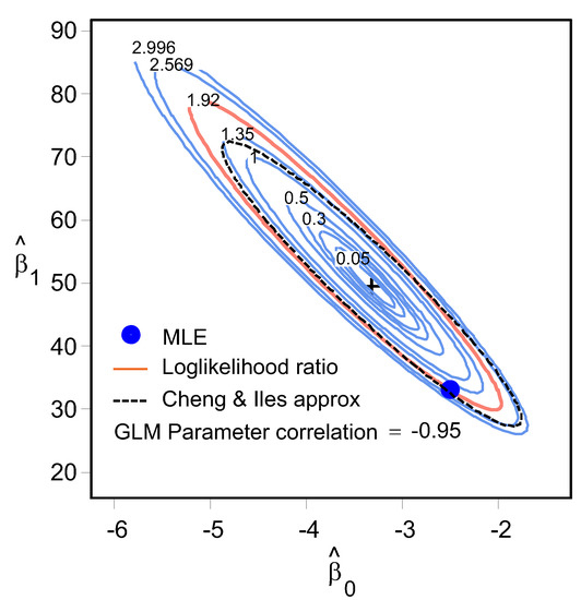 The likelihood ratio test is used to assess the goodness of two competing statistical models based on the ratio of their likelihoods. The log likelihood ratio contour encloses all pairs that are plausibly supported by the data. The confidence bounds are constructed on the surface contours using a method developed by the Cheng & Iles approximation [28].