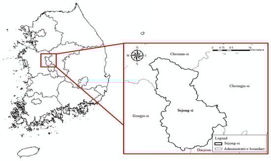 Sejong City in west-central Korea was selected as the study site for the methodology proposed in this study (Figure 1). As the recently relocated national administrative capital, this region has an urgent need to manage impervious areas due to rapid, continuous urbanization and a high rate of landcover change. Sejong City occupies an area of 465.23 km2, 77% of the size of Seoul. As of March 2018, its population numbered about 290,000, and was projected to increase over time due to ongoing urbanization. The combination of continuing large-scale urbanization with a high landcover change rate made Sejong City a suitable site for testing this study’s methodology.