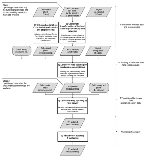 In consideration of these requirements, in this study we tested a method for the accurate and precise updating of Korean landcover maps with details based on various spatial databases in order to ensure accurate estimation of impervious surface areas; this would facilitate their accurate classification as the basis for nonpoint source management and stormwater utility fee collection in new urban areas. To this end, this study collected various spatial data and updated time-series items, corrected classification errors, and proposed a detailed landcover map update methodology that enables the detailed updating of pervious areas existing within impervious areas on an annual basis.