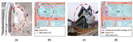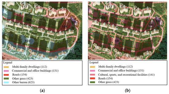 In the first process, misclassified and reclassified items were updated according to the criteria and temporal changes, respectively. Then, detailed classification of the grassland and barren land areas existing within urban dryland (the broad classification) prevailing in new urban areas was updated. Figure 3 shows the results of the first and second updates for an apartment complex in Sejong City. The land-use classes in the existing landcover map consisted of “multi-family dwellings” (112); “commercial office and buildings” (131); “roads” (154); “other grass” (423); and “other barren” (623). The first update resulted in the addition of “cultural, sports, and recreational facilities” (141) and correction of “other grass” and “other barren” areas to roads and cultural, sports, and recreational facilities.