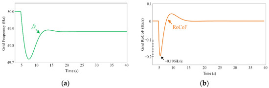 Due to the inertia of the SM, the power grid frequency does not immediately drop or increase with a high ramp rate. The instantaneous power imbalance is compensated by the mechanical energy of the rotor, resulting in a comparatively small variation in the system frequency. This process is known as the inertia response and usually takes less than 10 s. For a longer timescale, the speed governor control takes effect, and the frequency finally reaches a new equilibrium point. There are two important metrics that require attention, from the power system frequency stability perspective. One is the frequency nadir (fmin in Figure 3), and the other is the RoCoF value. When the frequency nadir goes beyond the normal operating range, proper measures, such as load shedding, should be taken, which causes a negative impact on electricity customers. In addition to this, the high RoCoF value may also cause a pole slip, trip the SM, and even lead to frequency instability. In this regard, many countries have set stringent requirements for the frequency nadir and the RoCoF.