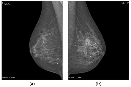 In the breast, cancer cells can increase to the lymph nodes and affect other body parts, i.e., lungs. Breast cancer usually begins with ductal dysfunction (invasive ductal carcinoma). Although, it can also originate in glandular tissues and other cells called lobules and breast tissue []. The researchers also found that changes in hormones, lifestyle, and the environment also increase the risk of breast cancer [,]. Low dose X-ray examination of the breast is utilized to envisage the internal structure of the breast. This process is medically called mammography. This is evaluated as the best suitable approach for the detection of breast cancer. Compared to previously used equipment, mammography shows the breast to a much lower radiation dose []. It is one of the most reliable screening tools and has been shown to be a significant approach for early breast cancer detection in recent times []. A mammogram of each breast was recorded in two different views, namely the medial-lateral oblique (MLO) view and the cranio-caudal (CC) view as shown in Figure 1. Estimated new cases recorded in 2021 were 281,550 and the percentage of all the new cancer cases was 14.8% in the U.S. The estimated deaths in 2021 was around 43,600 having a percentage of 7.2%. The 5-year relative survival rate of breast cancer from 2014 to 2019 was 92.16% in the U.S [].