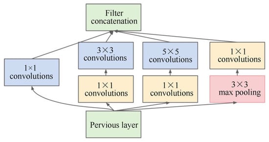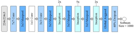 - Szegedy, C.; Liu, W.; Jia, Y.; Sermanet, P.; Reed, S.; Anguelov, D. Going deeper with convolutions. In Proceedings of the IEEE Conference on Computer Vision and Pattern Recognition (CVPR), Boston, MA, USA, 7–12 June 2015; pp. 1–9. [Google Scholar]