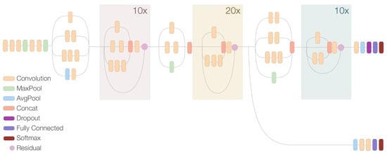 - Szegedy, C.; Ioffe, S.; Vanhoucke, V.; Alemi, A.A. Inception-v4, inception-resnet and the impact of residual connections on learning. In Proceedings of the Thirty-First AAAI Conference on Artificial Intelligence, San Francisco, CA, USA, 4–9 February 2017. [Google Scholar]