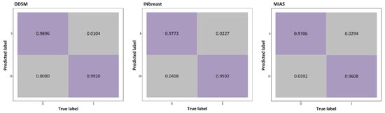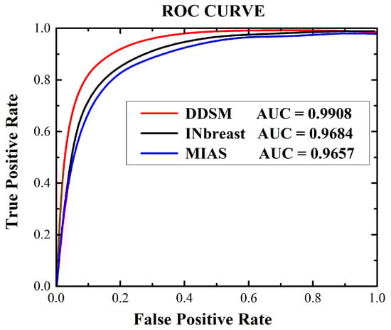 Receiver operating characteristic (ROC) plot for DDSM, INbreast, and MIAS datasets.