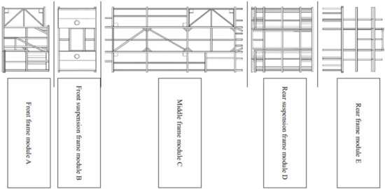 The bus chassis in this case consists of five modules that are defined according to their functions and layout in the vehicle [19], as shown in Figure 1.