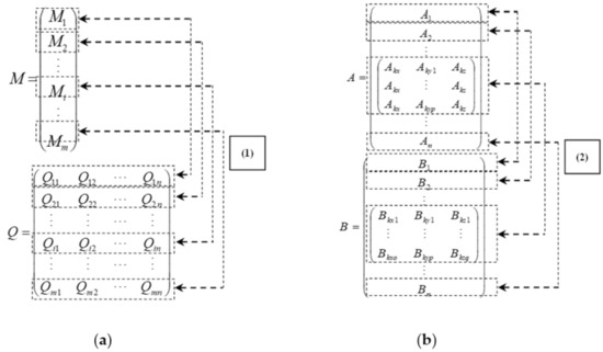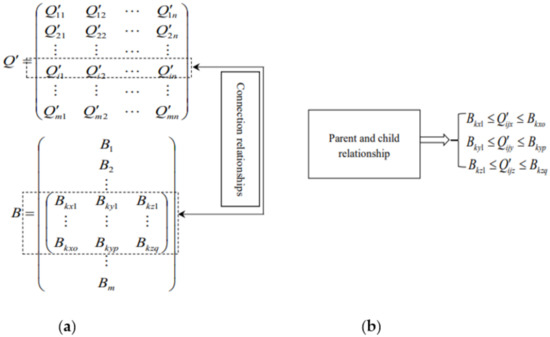 Figure 6. (a) The connection relationship between structural component (i) and structural component (k); (b) The parent and child relationship between matrix Qij and matrix.