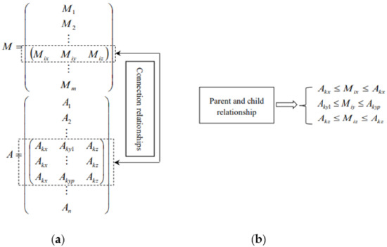 Figure 5. (a) The connection relationship between structural component numbered (i) and structural component numbered (k); (b) The parent and child relationship between matrix Mi and matrix Ak.