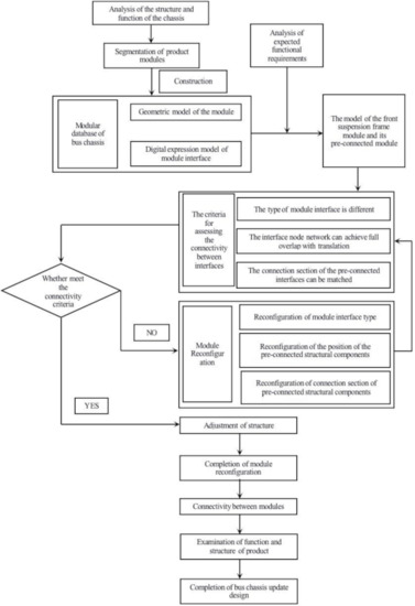 Modular design for a bus chassis is a practical solution to address different bus types and their differing powertrains. Physics interfaces are used to connect interacting subsystems in bus chassis modules. There are few studies focusing on the criteria for assessing interface connectivity, with significantly non-standard characteristics, between bus chassis modules. This study proposes criteria for assessing the interface connectivity in bus chassis modules in accordance with the digital expression of the module interface. Criteria for judging the compatibility of the connection between bus chassis modules are proposed and modular reconfiguration methods are provided, based on the criteria. Reconfiguration of the process matrix is constructed to indicate changes in position, shape, and size after the component is modified, based on the connectivity between modules. Finally, the proposed method is applied to the reconfiguration and replacement of the front suspension frame module of a bus chassis. The results demonstrated and proved the effectiveness of this method.