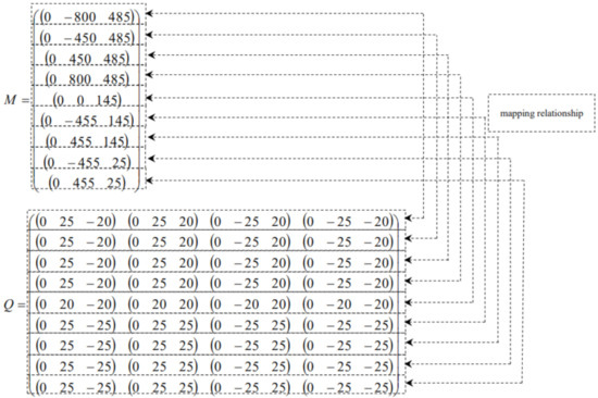 For the plug interface, the digital expression model of the interface is shown in Figure 4a, which includes the interface location matrix M and characterization matrix Q of the connection section. The location matrix M of the pre-connected structural component of the module interface is generated by the coordinate distance of each child node. The element in the matrix M represents the relative coordinates of a child node (i.e., the position of a pre-connected structural component). Each element in matrix Q is the relative coordinate of a feature point, which represents the relative direction and distance between the feature point on the connection section and the corresponding child node of the structural component.