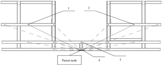 Table 1 shows the information for the front interface of the middle frame module, in which the adjustable child nodes represent the adjustable position of the pre-connected structural components. Bearing in mind that the interface module is layered along the z direction, the child nodes that have the same or the similar vertical coordinates are assigned to the same layer. Using the information in Table 1, the digital expression model of the front interface of the middle module is constructed, as shown in Figure 10. The model includes the interface location matrix M and the relative characterization matrix Q of the connection section. There is a mapping relationship between the two matrices. It reflects the number of rows of the two matrices that are equal. For example, the row (i) in the matrix M and the matrix Q, respectively, reflects the location and the geometric information of the pre-connected structural components numbered (i).