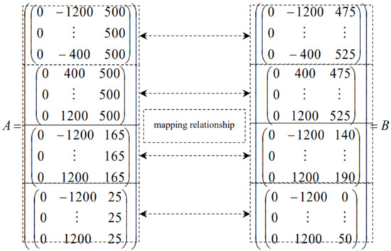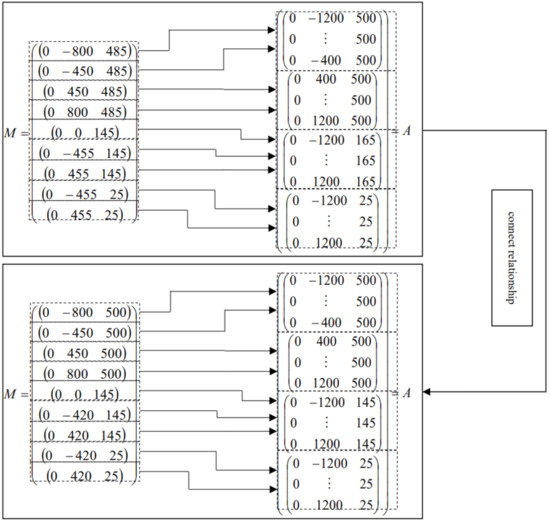 Table 2 contains the information for the rear interface of the front suspension frame module, in which the adjustable child nodes represent the adjustable position of the pre-connected structural components. The digital expression model includes the interface location matrix A and the acceptable range matrix B. The accepted ranges in matrices A and B are based on the addition of their position coordinates and the accepted relative ranges, as shown in Equations (3)–(5), where the subscript L corresponds to the direction of location of structural components and the subscript R corresponds to the direction of relative acceptable structural components. Using the information in Table 2 and the Equations (3)–(5), the digital expression model of the interface of the front suspension frame module is thereby constructed, as shown in Figure 12. A mapping relationship between the two matrices exists, which reflects the number of rows of the two matrices that are equal. For example, the row (k) in the matrix A represents the coordinate location of the pre-connected structural component numbered (k). At the same time, the row (k) in the matrix B reflects the acceptable range of the pre-connected structural component numbered (k).