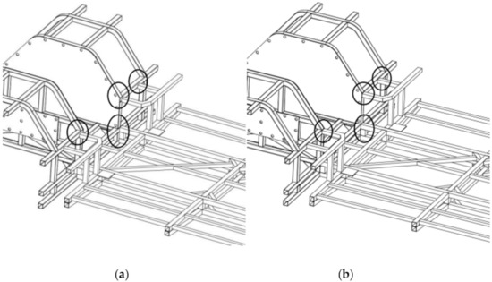 (a) Connections between the front suspension frame module and the middle frame module (without reconfiguration); (b) Connections between the front suspension frame module and the middle frame module (with reconfiguration).
