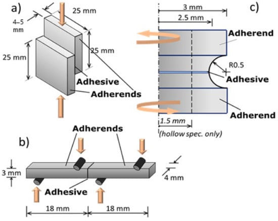 - Spaggiari, A.; Dragoni, E.; Brinson, H.F. Measuring the shear strength of structural adhesives with bonded beams under antisymmetric bending. Int. J. Adhes. Adhes. 2016, 67, 112–120. [Google Scholar] [CrossRef]