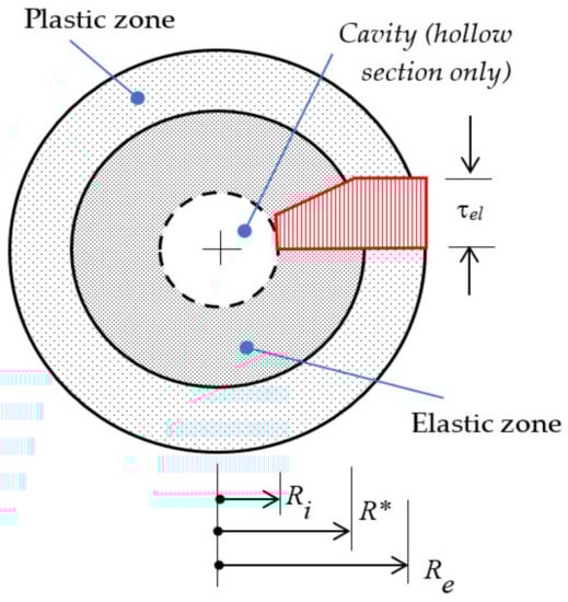 Torsion of a circular section creates a state of pure shear stress, as stated previously, with its peak value in the periphery. Once the maximum shear stress was achieved, the yield limit τel and the applied torsional moment was increased and a plastic annular zone was formed in the outer part of the cross section from radius R* to radius Re, whilst a circular zone (or annular, if the section was hollow with inner radius Ri) in the central part of the cross section remained elastic. Figure 4 depicts the situation.