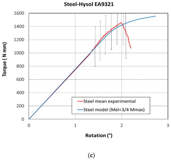 More interesting were the results of the THG tests reported in terms of torsional moment vs. rotation angle diagrams. Figure 5a–c displays the experimental curves and the corresponding model counterparts.