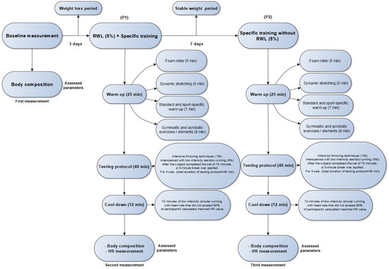 This study included two phases. In phase one (P1), the group composed of combat sports athletes had to lose 5% of their body weight and carried out HISST while heart rate was monitored. In this phase, participants started losing weight rapidly two days before the day of the training. The day of training (testing) was the last day of their RWL period, after which the measurements were performed. In the second phase (P2), seven days later, an identical high-intensity training protocol was carried out with no rapid weight loss procedure included (Figure 1). The total duration of the training was 90 min. All the participants were familiar with the testing procedure. The participants were instructed to perform the protocol with the same sparring partner on both occasions (P1 and P2). The high-intensity sport-specific training consisted of four sets of a maximal number of throws with work to rest ratio: 15:45 s, with each set lasting 10 min with a break of 3 min in between. Heart rate recovery was measured at three time points: the first, second, and third minute after each set of throws. During the test, participants performed shoulder throws. A heart rate monitor was attached to all participants (Polar-H10 heart rate sensor, Polar Pro chest strap) from the beginning to the end of the training session. The heart rate monitoring was performed using an iPad Pro 10, Polar Team application.
