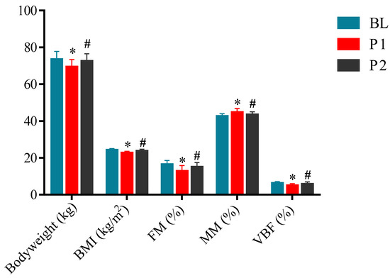 Descriptive characteristics of wrestlers’ body composition. Legend: BL—baseline values; P1—phase one: HISST combined with RWL; P2—phase two: HISST with no RWL procedures included; BMI—body mass index (kg/m2); FM—fat mass (%); MM—muscle mass (%); VBF—visceral body fat (%); * statistically significant difference in relation to the baseline values, p ≤ 0.001; # statistically significant difference in relation to phase P1, p < 0.01.