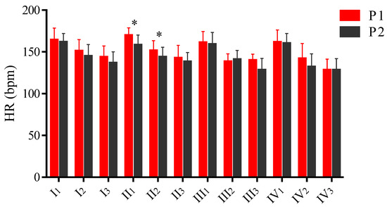 Heart rate recovery during 2 phases. Legend: I1—first minute of recovery in first round, I2—second minute of recovery in first round, etc.; P1—phase one: HISST combined with RWL; P2—phase two: HISST with no RWL procedures included; HR bpm—heart rate values; * statistically significant difference, p < 0.05.