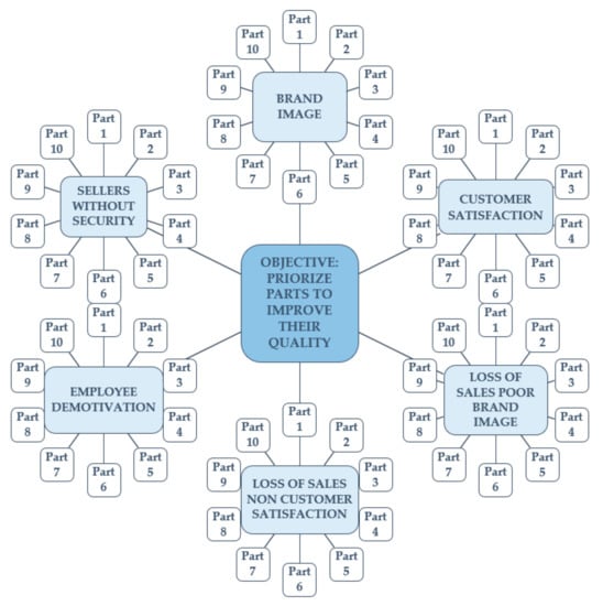 For the above, the layout of this article is as follows: firstly, data was downloaded from the ERP of a manufacturing company, to obtain the list of parts with incidents during the 2-year warranty period, the financial impact, and number of incidents by part (tangible costs). Additionally, the Delphi method [] was applied, sending surveys to several stakeholders within the company to identify intangible costs. With the previous information, Analytic Hierarchy Process (AHP) [,,,,,,,] and Analytic Network Process (ANP) [,] were implemented. Each process had their own results. A comparison and complete result analysis was undertaken to grant the most efficient results. Finally, results of multi-criteria analysis were optimized by applying an effort–impact matrix based on Lean methodology to obtain the final result and consequently the most efficient decision in terms of quality improvement and reengineering.