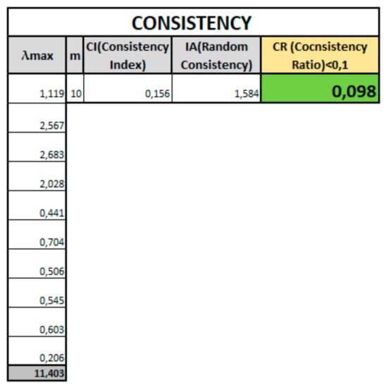 The closer to the above-mentioned values, the more consistent the judgments established in paired comparisons will be. If these values are exceeded, it means that the judgments are inconsistent and random, so they must be reviewed and corrected. The following formulas show the consistency calculation [].