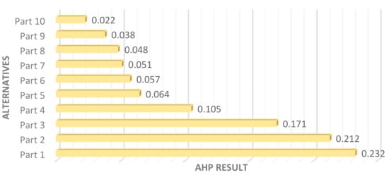 In ANP, Part 8 appears as the main priority when in AHP was not in top 4 priorities, meaning that Part 8 has a high influence on the failure of the remaining parts and has a high influence on criteria as well. If this part has a failure, the remaining parts may fail because of its defect and this component might have a high impact on intangible criteria such as customer satisfaction, brand reputation, etc. This significant appreciation is only reflected in the ANP process because, as was mentioned in point 3, this process applies more interrelationships compared with AHP, providing a more realistic result.