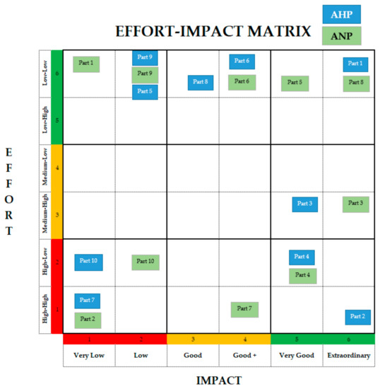 Comparing the effort–impact matrix result with the ANP and AHP combined result, Part 2 was excluded, which has a very high reengineering cost of EUR 2.380.000, warranty cost of EUR 575.147, and number of incidents of 245, so applying improvements in this part has reengineering costs that are too high with low return of investment. This proves that the Lean effort–impact matrix maximized and optimized the result of the multi-criteria analysis.