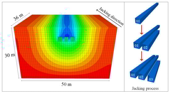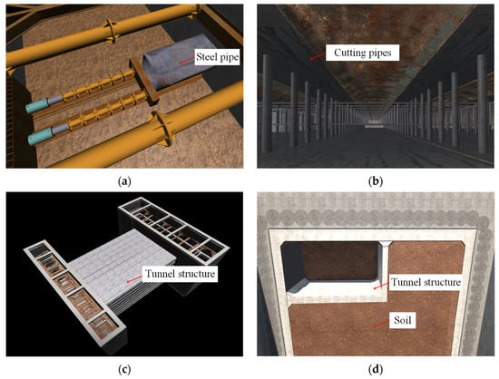 Urban underground space is becoming increasingly crowded with the development and expansion of cities, and the open-cut construction method has gradually been unable to meet the needs of many urban underground engineering constructions. Pipe jacking is a common trenchless construction method, which has been widely used in the construction of sewers, pressurized pipelines, electricity lines, tunnels, etc. [1,2,3]. For the purpose of coping with the complex construction environment, the pipe roof method is applied to the construction of crossing roads, railways, bridges, buildings, and other adjacent structures [4,5]. On the basis of the pipe jacking method and pipe roof method, the pipe roof structure method came into being, which is also known as the new pipe roof method or pipe roof preconstruction method [6,7,8,9].