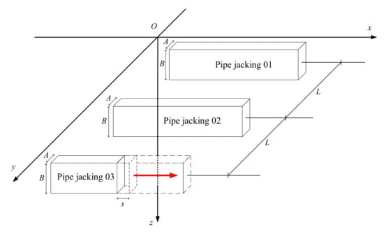 It is assumed that the construction of pipes 01 and 02 has already been completed, and the excavation face of the pipe jacking machine 03 is located in the plane of x = 0.