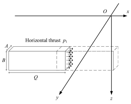 As shown in Figure 4, the additional horizontal thrust per unit area of excavation face during jacking construction of a pipe jacking machine is p1dζdη. By integrating Equation (1), the vertical displacement w1 caused by the additional horizontal thrust on the excavation surface can be obtained as