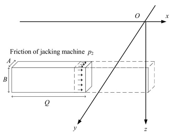 As shown in Figure 5, the friction per unit area on the top surface of the pipe jacking machine during jacking is p2udξdζ. The vertical displacement of the point (x, y, z) in the soil is w2u under the action of friction on the top of the pipe jacking machine.