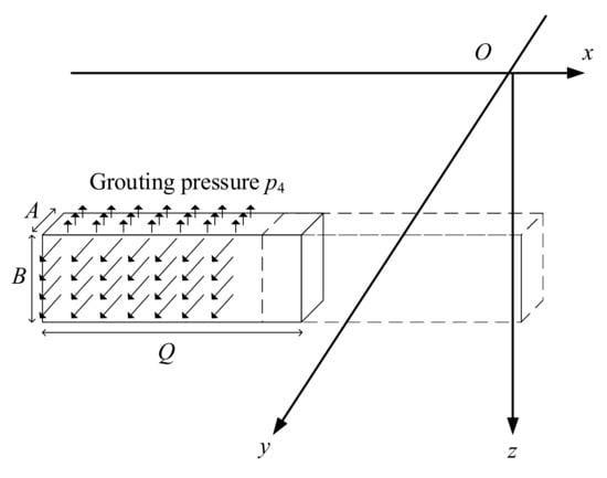 As shown in Figure 7, the additional grouting pressure per unit area on the top surface of the subsequent pipe during jacking is p4udξdζ. Under the action of the additional grouting pressure on the top surface of the pipe, the vertical displacement w4u of the point (x, y, z) in the soil can be calculated as
