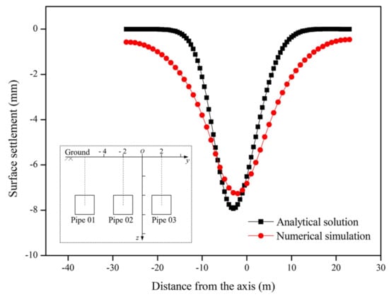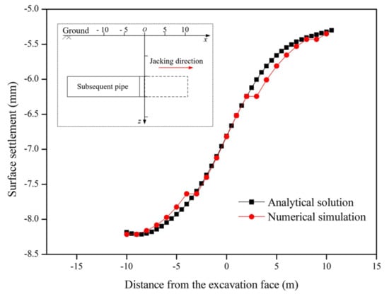 It is obvious that the development of the ground surface settlement is of great significance during the construction of the underground pipe roof structure, especially in the process of pipe jacking construction. At present, the prediction methods of stratum deformation caused by the construction of tunnels mainly include the empirical formula method [18,19], theoretical analysis [20,21,22], numerical simulation [23], laboratory model test [24], and in situ monitoring [8]. Among them, the Peck empirical formula [18] was the first and most widely used method. However, it cannot take into account the influence of shallow burying and shape of the tunnel cross-section. Then, the stochastic medium method [25] was proposed, which can effectively make up for these deficiencies. The complex variable method [26,27] can simplify the complex problems in the physical plane to facilitate the solution of the problem; thus, it was introduced into the field of underground engineering by scholars to predict the ground settlement [28,29]. In addition, there are the virtual image technique [20], stress function analytical solution [21], and Mindlin’s solution [30], where Mindlin’s solution can consider the influence of the construction process on stratum deformation, which makes it a suitable and fast prediction method. The pipe roof structure method can effectively control the development of ground settlement in urban underground engineering construction. However, until now, there has seldom been research on the stratum deformation caused by this construction method.